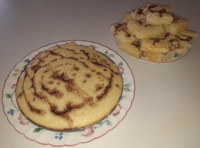 Combine brown sugar and cinnamon. Sprinkle over the cake. Drizzle melted butter over the top.